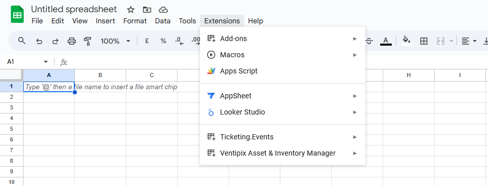 Once installed, the Ventipix Asset & Inventory Manager add-on will be available from the Extensions menu in Google Sheets.